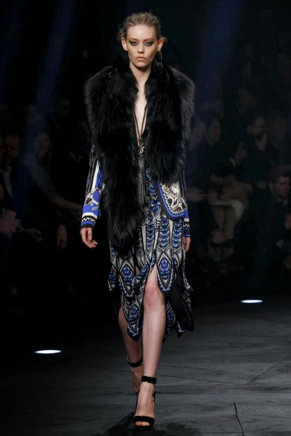 The Roberto Cavalli show was really feminine and he used a lot of grey, black and white in the clothing. The outerwear was definitely my favorite. The collection captured a lot of beautiful ponchos and long coats for the autumn/winter season. Besides he had a lot of bejeweled dresses and pants in his collection which makes this collection very glamourous.